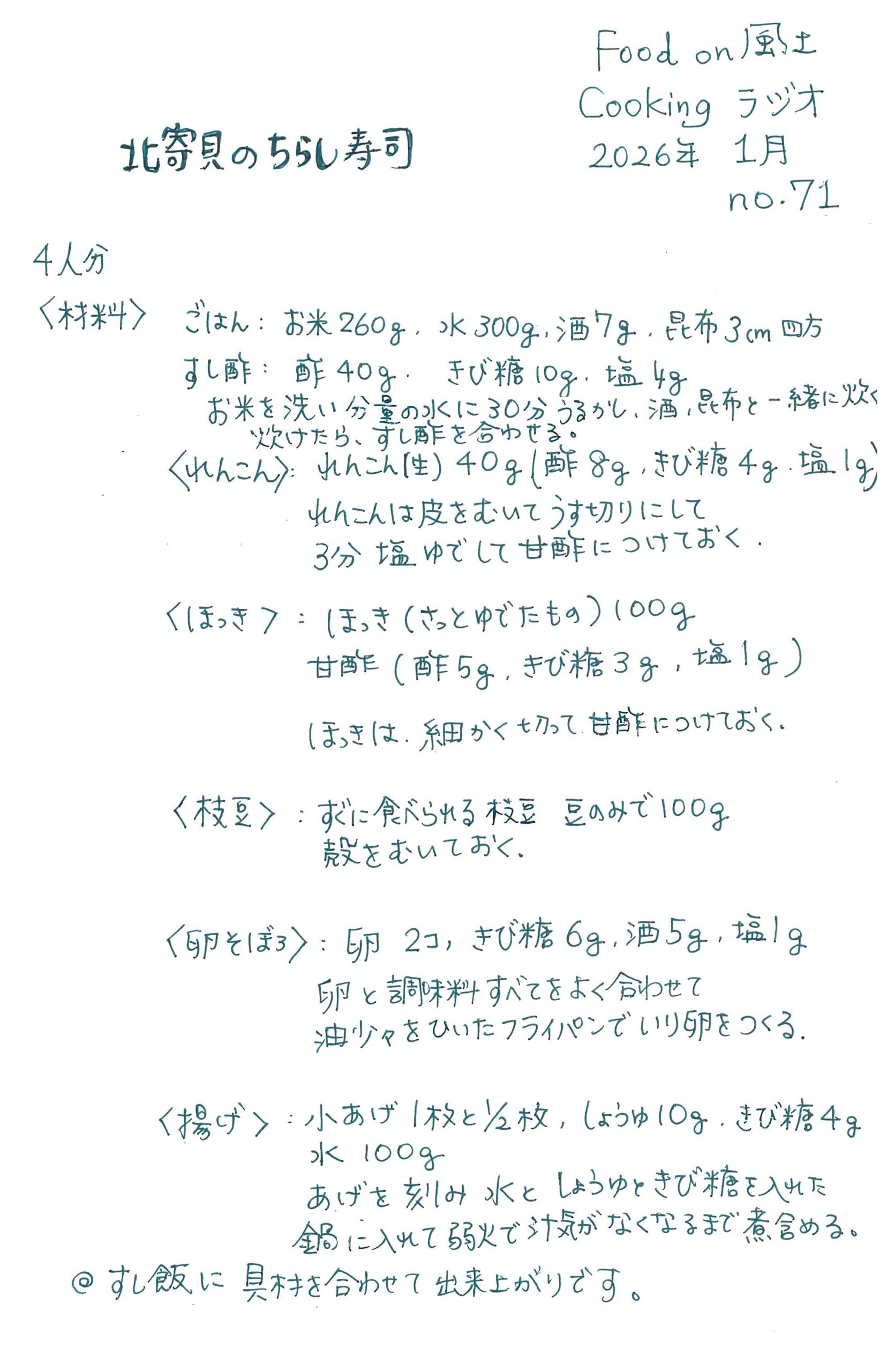 2026.01.20 Food on 風土ラジオ~ 北寄貝のちらし寿司 ちらし寿司というと・・・ 自分で作るのはちょっと大変という方でも これはとっても簡単!! 北寄貝のピンク色が綺麗なちらし寿司 ぜひ一度ご賞味ください FOOD on 風土ラジオ 講師:金澤明香(管理栄養士)